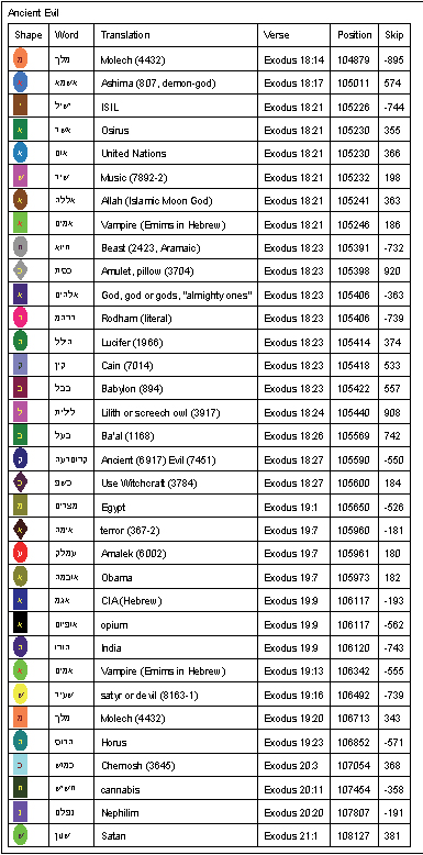 It was not long before Mr. Mack realized that "the Ancient Evil" and the "Sons/Children of Belial" were somehow connected. Many of the words Olaf wrote in his reports were the same as what appeared in the following Bible Code.