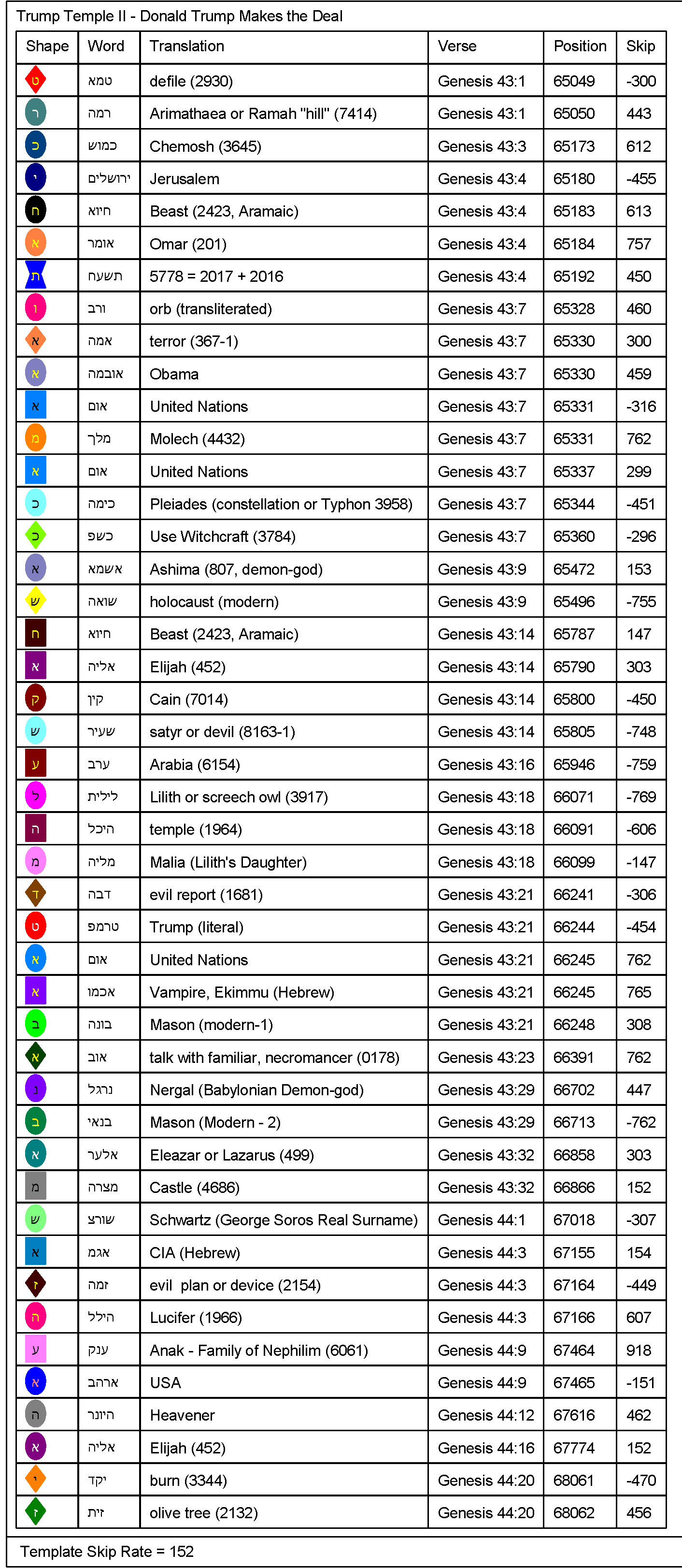 When we see this Bible Code, we see the author of The Art of the Deal at his finest. We see him working the biggest land and building deal of his life. This one deal that will cement his status as the greatest deal-maker of all time. Yes, it might be the greatest land and building deal of all time, but at what cost... you mean there could be a downside to this? Let's review the previously posted Bible Codes in light of this one and see what might be happening.