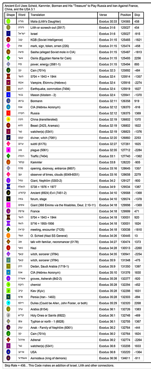 The other shocking element in this Bible Code is the fact that the Dulles brothers (Allen - CIA Director and John Foster - Secretary of State, both in the Eisenhower Administration) are representing the United States in this and Allen Dulles is using his Russian connection codenamed "Sasha" to bring the Israelis into the auction to counterbalance Egypt and Saudi Arabia.