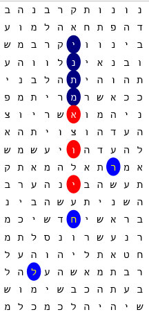 This code is interesting because both the aleph (א) the words for "terrible" and "beast" are shared in common and the cheth (ח) in the Hebrew words for "beast" and "dreadful" are also in common. The skip rate on this code is very small, meaning the "randomness risk" in this code is very low. A code searcher would consider this a very good start to a very interesting code. Click here to go to the next page to learn what this Bible Code tells us.